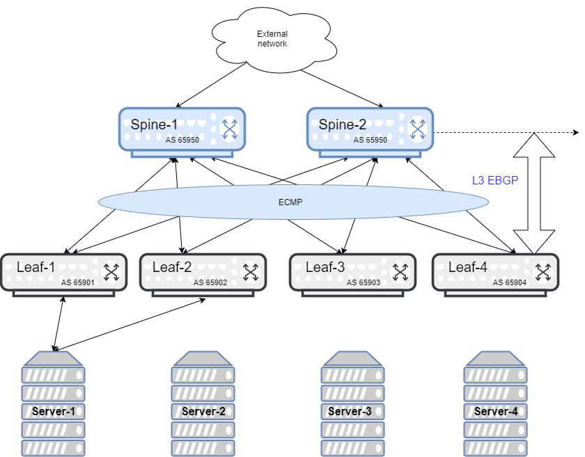 Архитектура Leaf-Spine, основанная на топологии Клоза, является высокомасштабируемым и эффективным способом построения крупномасштабных сетей центров обработки данных.